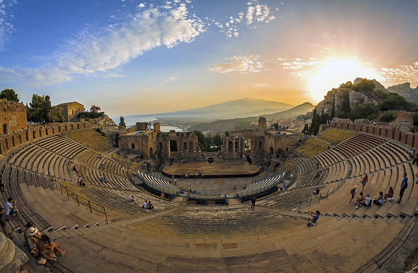 Taormina é uma cidade que fica no topo da colina, a 55km do Etna. A atração principal é o Teatro Grego, antigo teatro greco-romano ainda em funcionamento.
