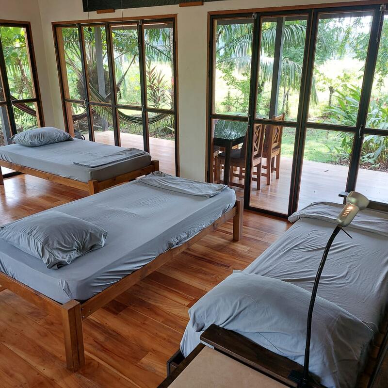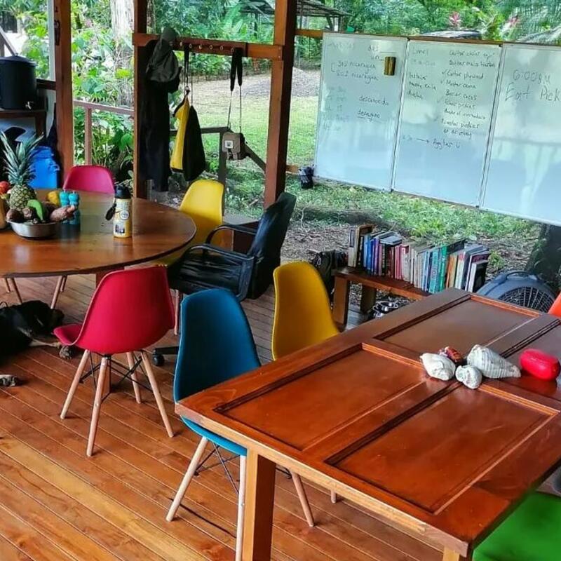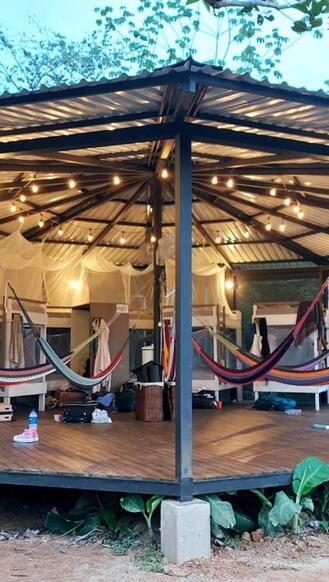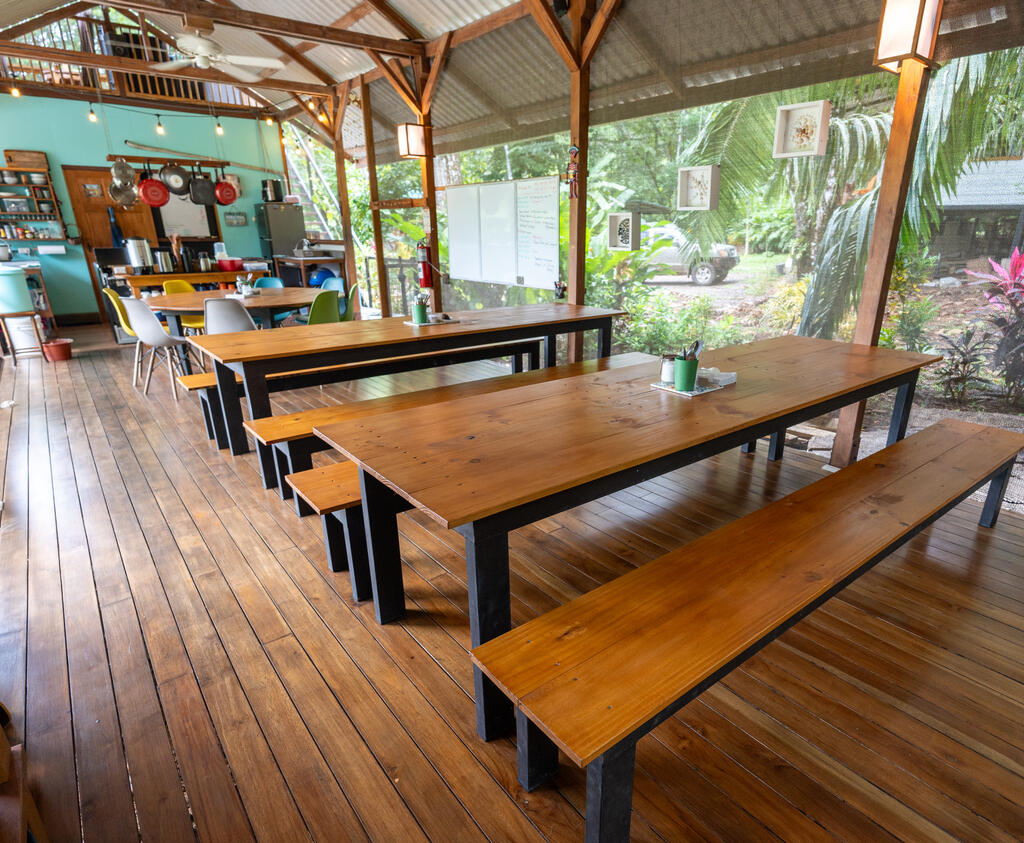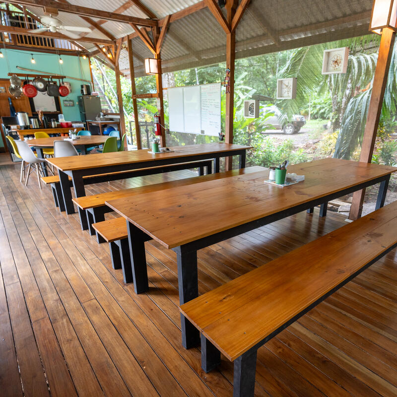 The open-air structure welcomes a gentle breeze and the sounds of the surrounding rainforest, enhancing the immersive experience of living in one of the world's most biodiverse regions. There are 9 hammocks strung within the space, and the dorm's construction has a wooden platform and a metal roof that provides shelter from the tropical rains.