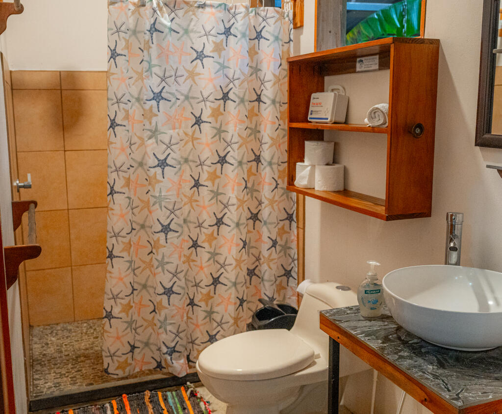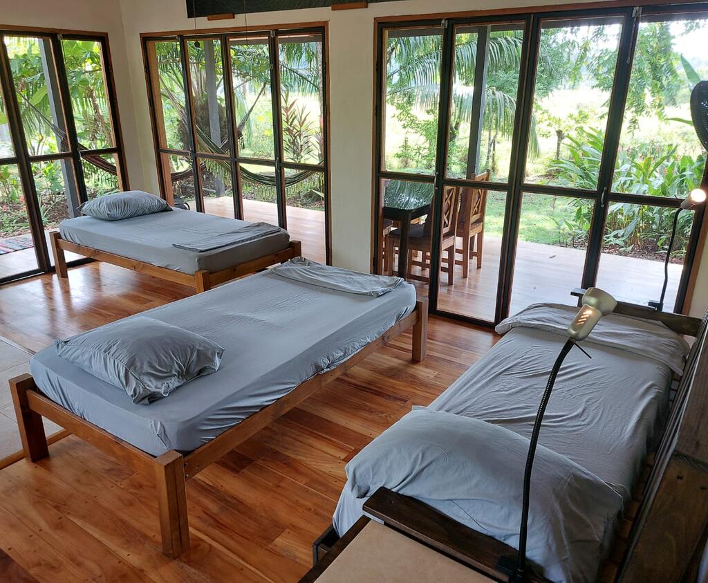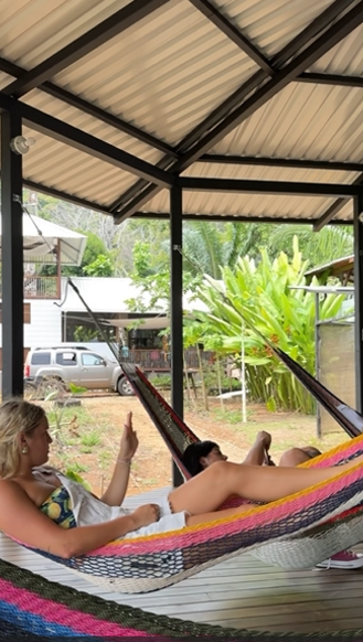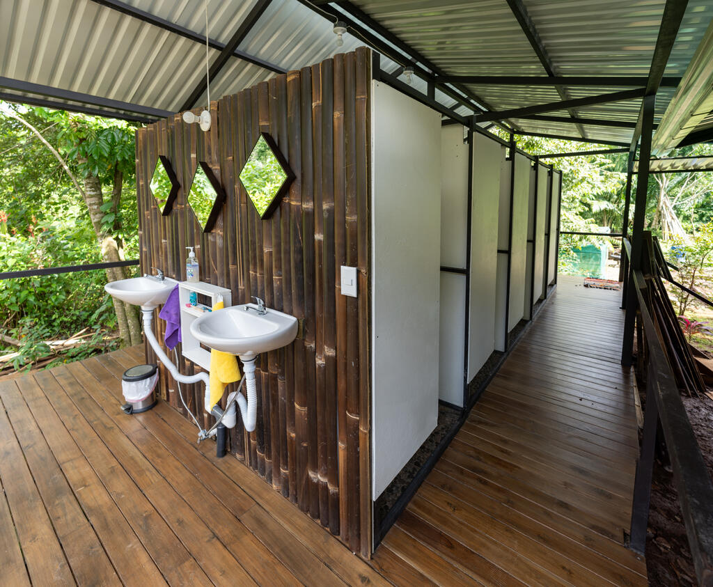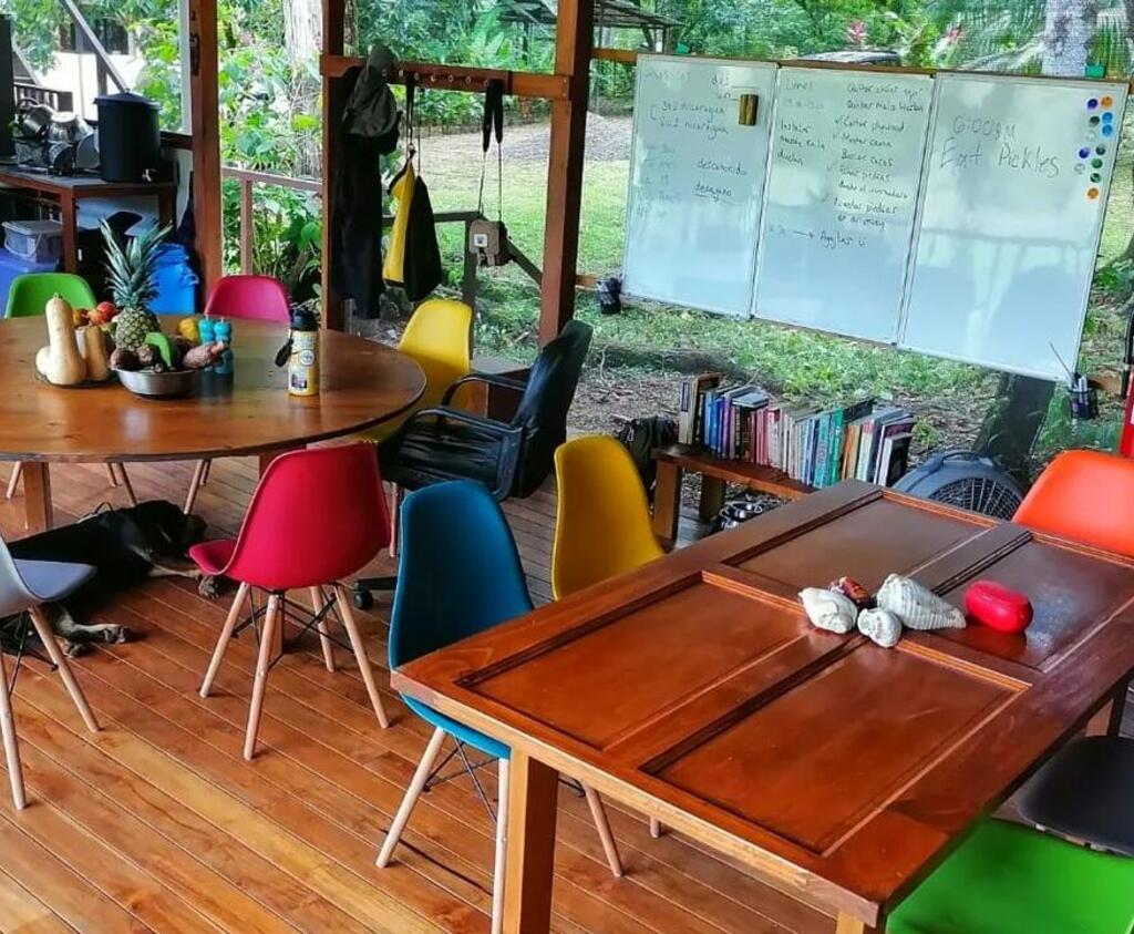 The open-air structure welcomes a gentle breeze and the sounds of the surrounding rainforest, enhancing the immersive experience of living in one of the world's most biodiverse regions. There are 9 hammocks strung within the space, and the dorm's construction has a wooden platform and a metal roof that provides shelter from the tropical rains.