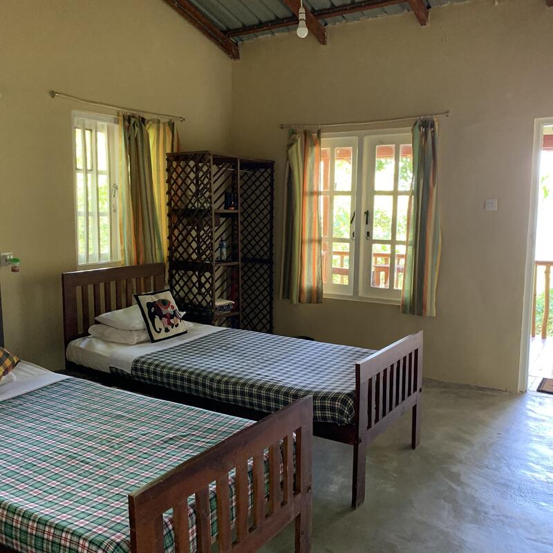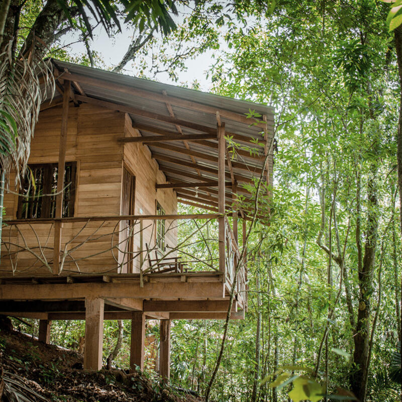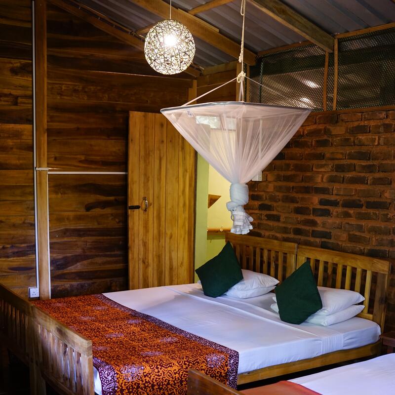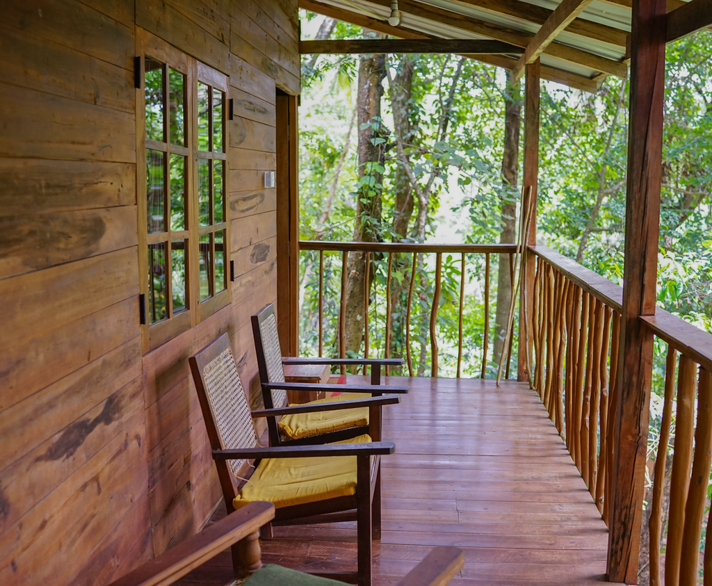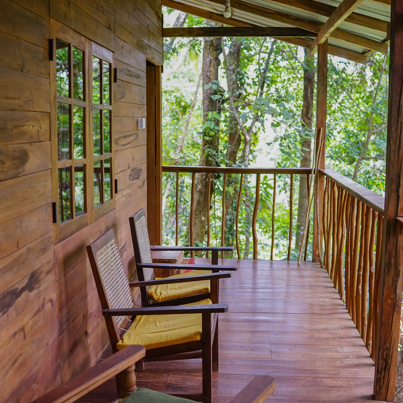 Stay in one of the four unique wooden cabanas, crafted in a traditional style by local villagers. Your private cabana features a balcony to enjoy the forest sounds, an ensuite bathroom with hot water, and a mosquito net. This is the perfect option for a peaceful, solo retreat or for a couple. You will be assigned one of the four stunning wooden cabanas based on availability.