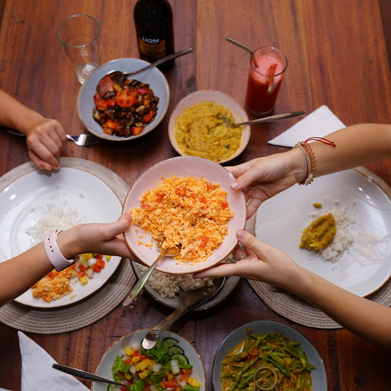Get ready to fuel your impact with amazing local food. Three authentic Sri Lankan meals are provided for the group every day (breakfast, lunch, and dinner). Travelers will explore the true taste of the region, enjoying flavorful local dishes like the famous "rice and curry" among other specialties, mixed with western traditional dishes. The kitchen is fully prepared for dietary needs, with delicious vegan and vegetarian options always available. It's an authentic jungle-to-table experience.