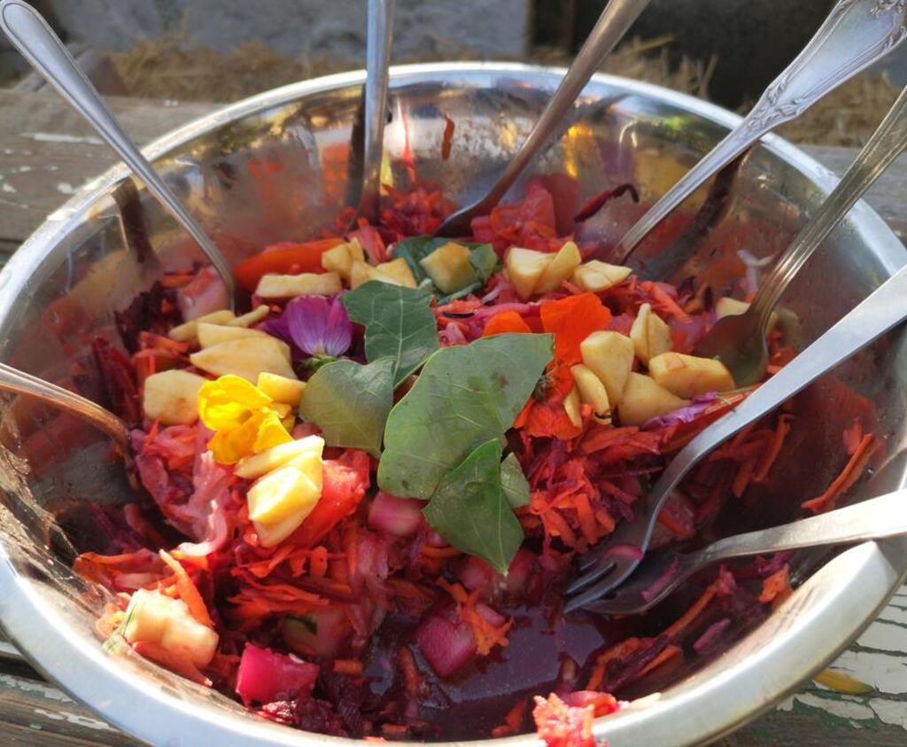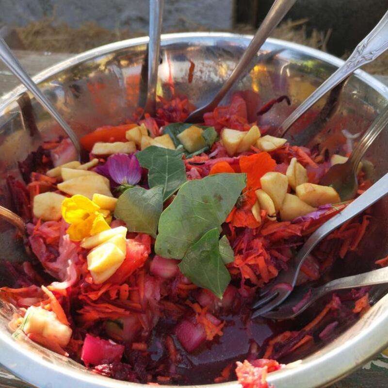 Enjoy three delicious vegetarian meals daily, made with ingredients straight from our garden or local markets, supporting the economy. In addition to tasty pies, hummus, veggie burgers, salads, soups, and more, you'll also be part of the kitchen team and learn recipes while helping with meal prep.