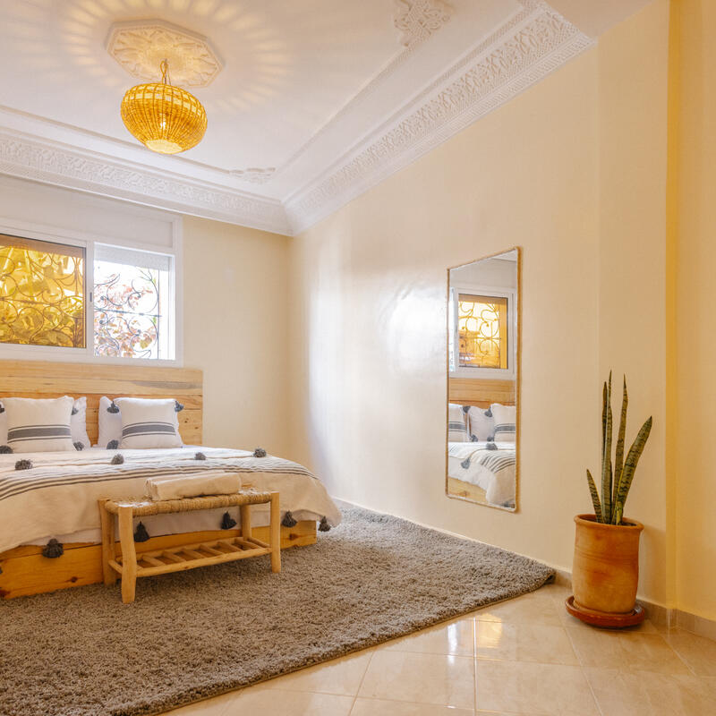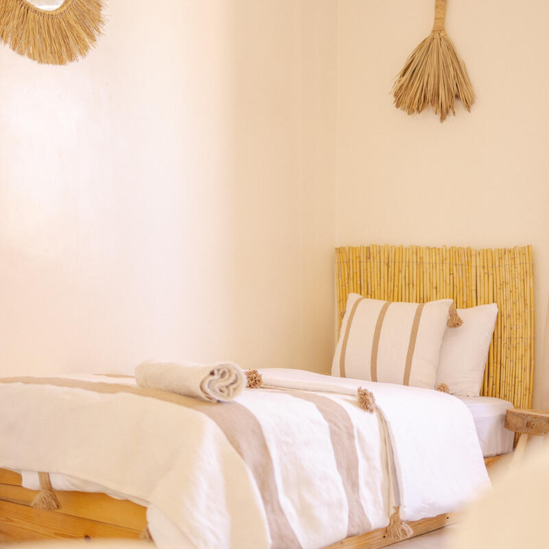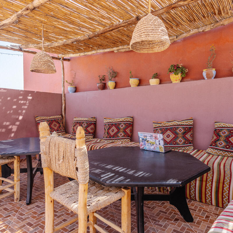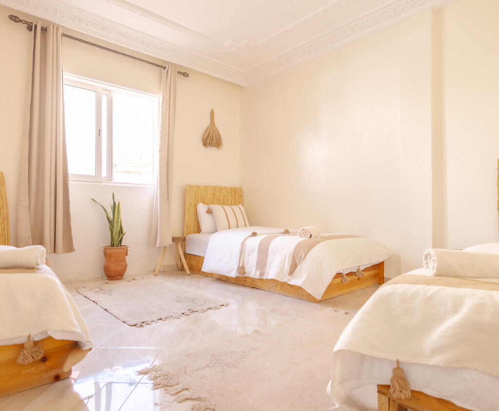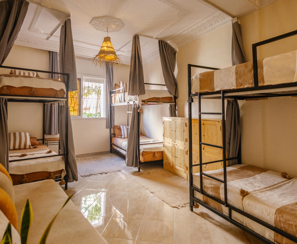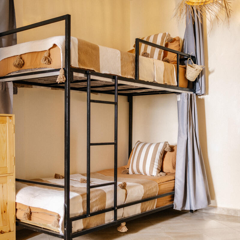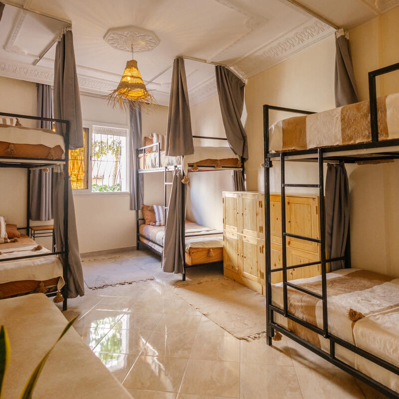 This triple room strikes the perfect balance between social connection and rest. Fitted with three single beds, it is the ideal setup for a small squad traveling together or solo travelers who want to make connections without the bustle of a larger dorm. The room includes personal storage for belongings and access to well-maintained shared bathrooms, creating a comfortable, intimate base for the group’s Moroccan adventure.