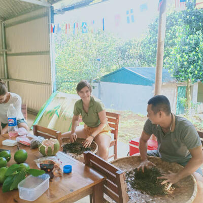 I stayed in the lodge one week and really enjoyed the time. I got to know how life is in a small village and what tasks there are at the everyday life in a farm. There was always something new to discover and to do. I even made my own the lodge step by step. I also had a lot of free time, where I played pingpong. Tuan and Dat were great host. We had a lot of fun together. For example at playing cards, learning some Vietnamese words or helping in the garden. It was no problem that I'am vegetarian, because they always cooked freshly and I got to know a lot of Vietnamese food.