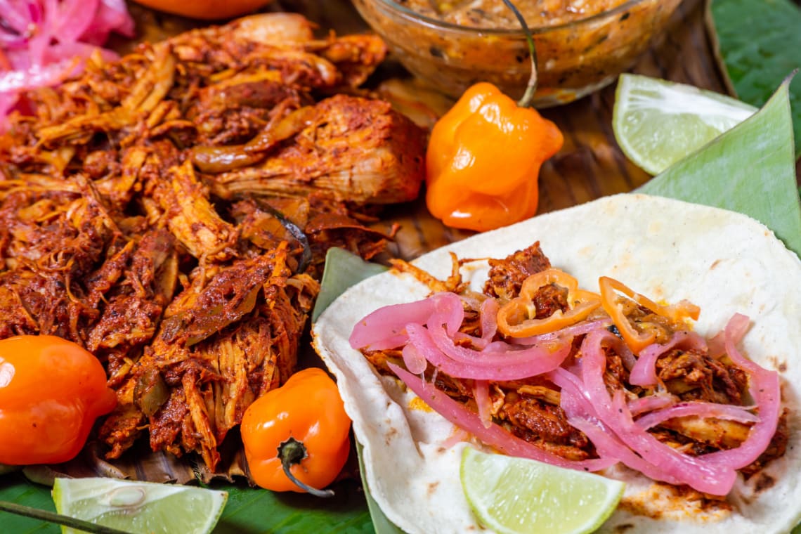 Tacos de cochinita: Sin duda los mejores tacos del sur de México, específicamente del estado de Yucatán. Se preparan con carne de cerdo que se marina con achiote y naranja. Posteriormente, se envuelve la carne en hojas de plátano y se cuece.