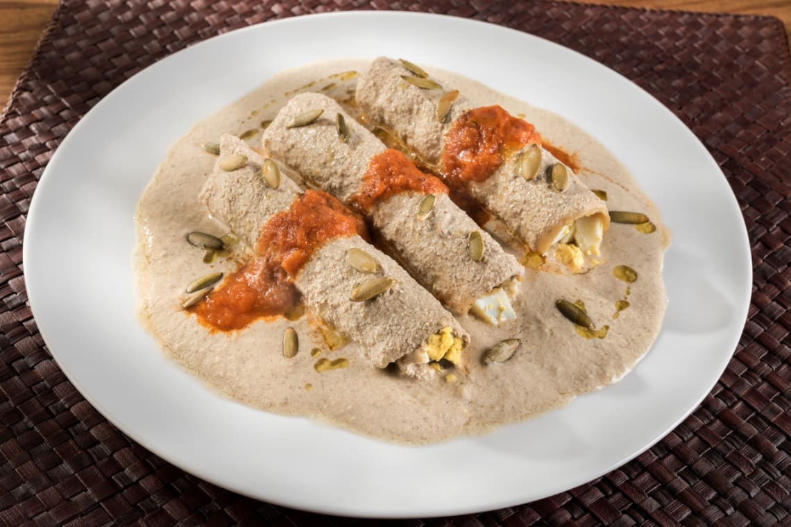 Los papadzules son otro de los íconos entre los platillos típicos de Yucatán. Una especie de enchilada yucateca rellena de huevo cocido con un aderezo elaborado con pepitas de calabaza y epazote. También se les puede agregar una salsa a base de jitomate y chile habanero.
