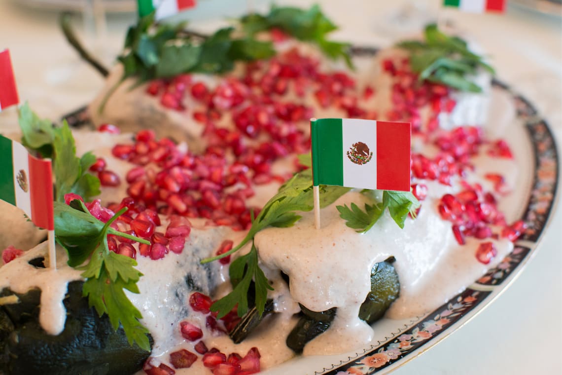 Está preparado con chile poblano relleno generalmente con carne, picadillo y frutas, cubierto con el ingrediente principal: la crema de nuez de Castilla, perejil y granada, que juntos simbolizan los tres colores de la bandera mexicana.