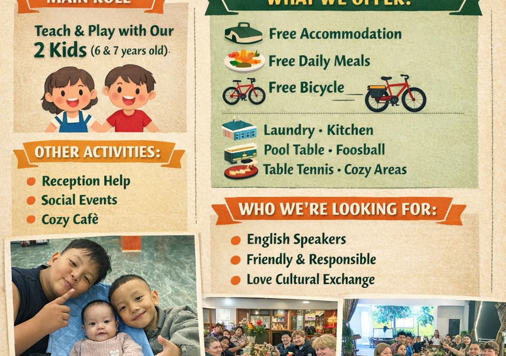 🌿 English Volunteer Opportunity in Phong Nha, Vietnam 🌿 Join our family-run hostel, Green Riverside Cosy Home, surrounded by nature and river views. We’re looking for English-speaking volunteers to help practice English with our children (6 & 7 years old) and support reception, social activities, or our Cozy Café. In return, enjoy free accommodation, meals, bicycles, and full access to hostel facilities while experiencing local life and culture