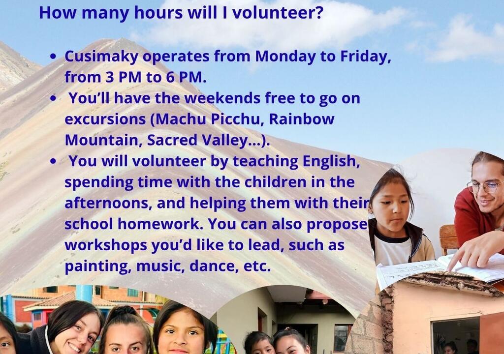 Volunteering at Cusimaki was the best experiences we have ever had Helping the children with homework, and organising activities really made us appreciate the importance of the work of this kind of association Cusimaki is a great opportunity for them to build their future developing new skills. Most of them come from difficult socio-economical situations and they can't access to extracurricular activities San Jeronimo isn't a turistic place so we could deeply connect with the locals The accomodation is comfortable and cozy. We felt very welcome by Mrs Lucy Definitely recommend it