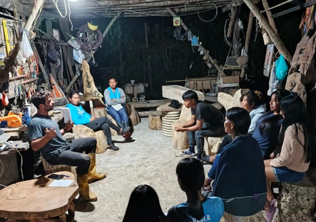 Trabajamos con troncos, ramas y raíces, no tumbamos arboles, utilizamos los desechos de la madera 🌳. Elaboramos muebles, esculturas y artesanías. Cultivamos plátano, yuka, café, cacao, pinya, caña de azúcar, chonta, guayusa, coma, ayahuasca, tabaco. Elaboramos el cacao, el café, el queso, el vinillo. Vendemos tortillas de harina de maíz con café y chocolate en Papyacta, Tena, Baeza y nuestro rancho donde vivimos. El hospedaje es en carpa ⛺