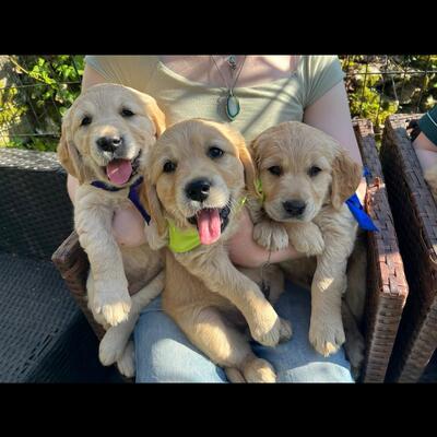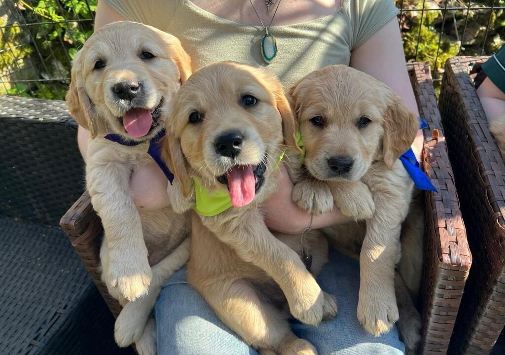 Golden Retriever puppy sitting and housework